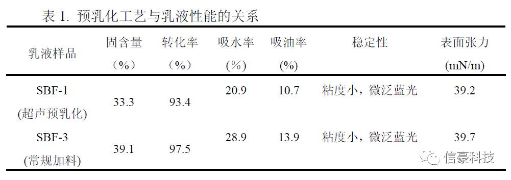 由上表可以看出,采用超聲預乳化工藝合成的乳液SBF-1的單體轉化率明顯高于采用常規單體加料方式所合成的乳液SBF-3。并且采用超聲預乳化工藝相對于單體直接滴加的工藝,前者可使共聚單體混合更加均勻,避免單體珠滴從水相體系中吸附乳化劑,從而提高乳液的穩定性與共聚單體的轉化率。同時,采用該種預乳化工藝合成的乳液,表面張力略低于后者,因此,其乳膠膜的抗水、抗油性較好。